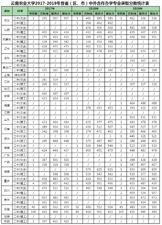 云南农业大学2017-2019年中外合作办学类录取分数线