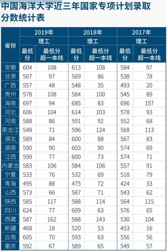 中国海洋大学2017-2019年国家专项计划录取分数线