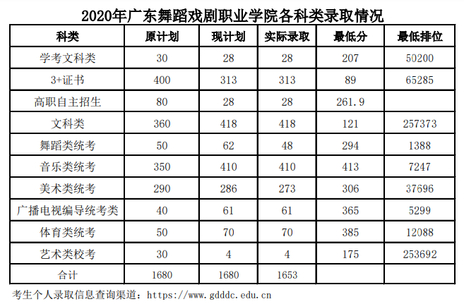 2020年广东舞蹈戏剧职业学院各科类录取情况