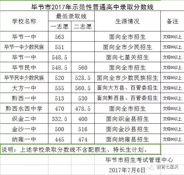 毕节市2017年示范性普通高中录取分数线已划定,详见下图。
