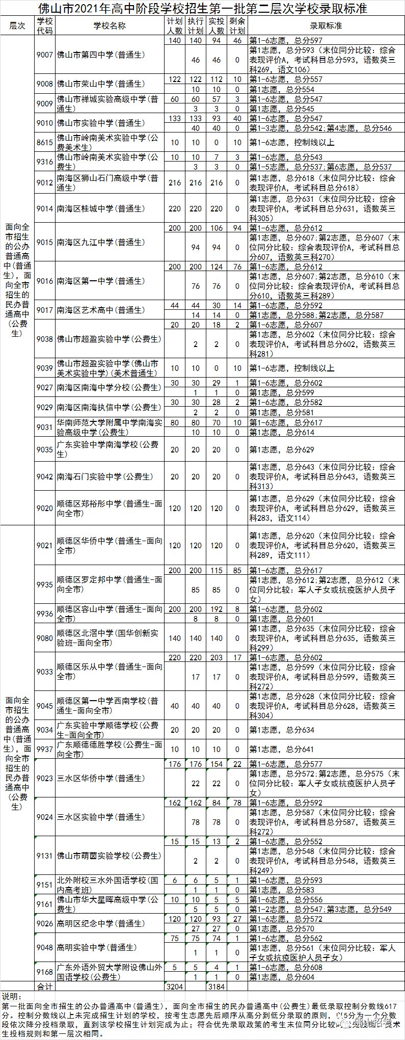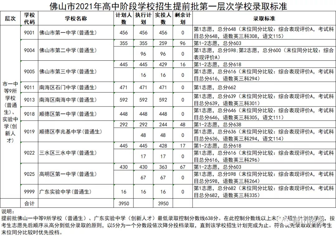 经研究,2021年佛山市高中阶段学校招生提前批、第一批录取控制分数线及学校录取标准如下: