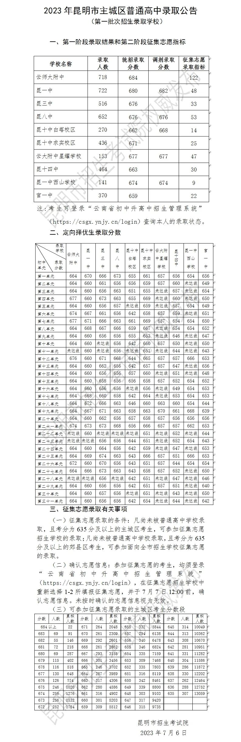 7月6日,昆明市招生考试院公布2023年昆明中考普通高中提前批次、第一批次招生录取学校录取公告。