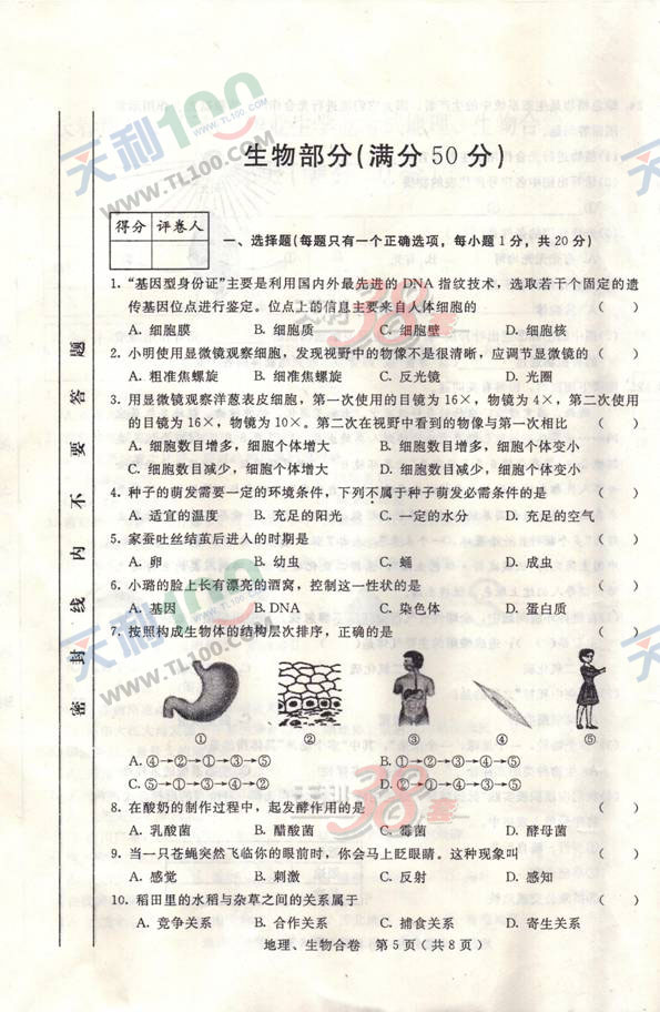 长春市2010年中考生物试题及答案