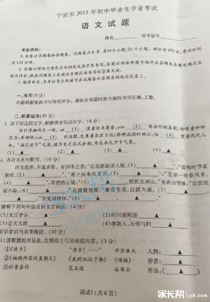 2015浙江宁波市中考正在进行中,91中考网在考试后及时公布宁波中考试题、答案和中考作文。祝各位考生都能取得好的成绩。2015年浙江省宁波中考语文试题(图片版):