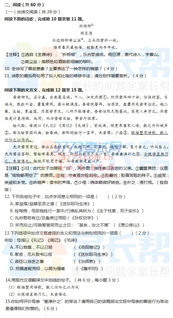 2017长沙中考语文试卷试题及答案
