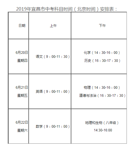 2019年宜昌市中考九年级考试科目为:语文、数学、英语、物理、化学、道德与法治、历史、体育;八年级考试科目为:地理、生物,考试形式为闭卷;体育考试为项目测试。