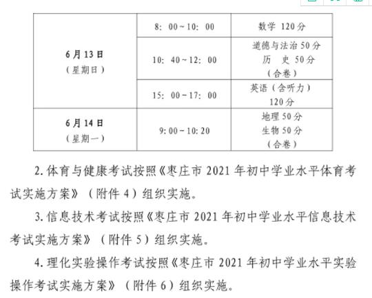 《枣庄市2021年初中学业水平考试暨高中段学校招生工作方案》公布,报名时间为5月6日至10日,文化课考试时间安排在线6月12日至14日。