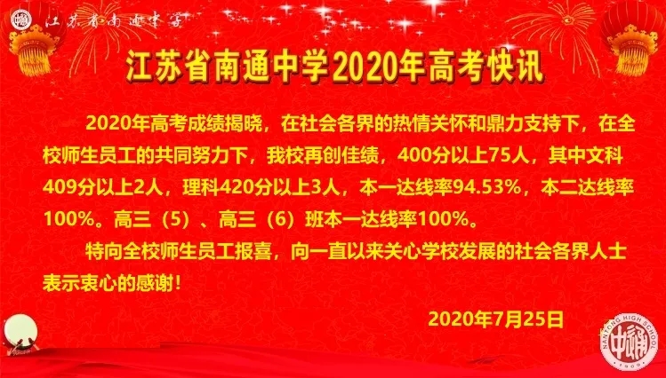 2020南通中学高考喜报成绩、本科一本上线人数情况