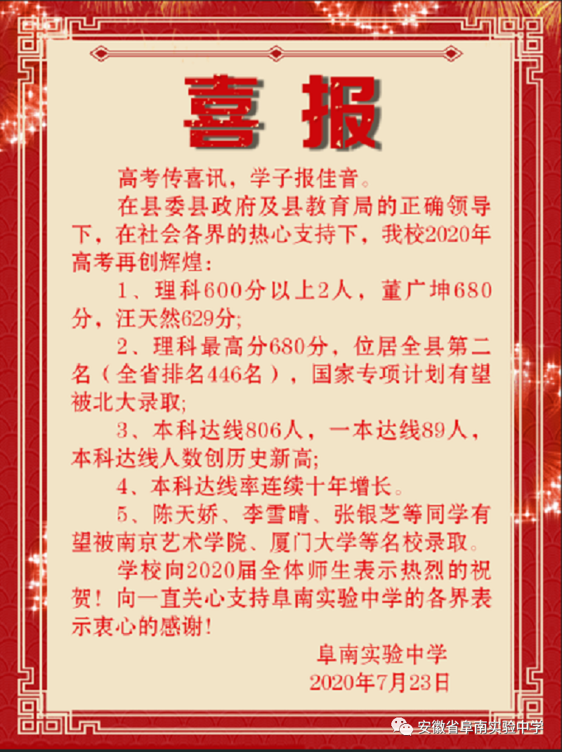2020颍上二中高考喜报成绩、一本二本上线人数情况