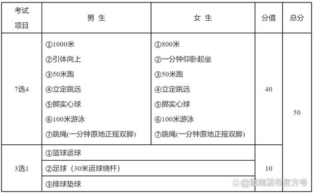 按照甘肃省教育厅《关于做好2023年全省高中阶段学校考试招生体育科目考试工作的通知》(甘教体函〔2023〕3号)精神,2023年全市中考体育考试暂时不设置必考项,考生在10个规定项目中自选5项,每项占10分,总分50分。